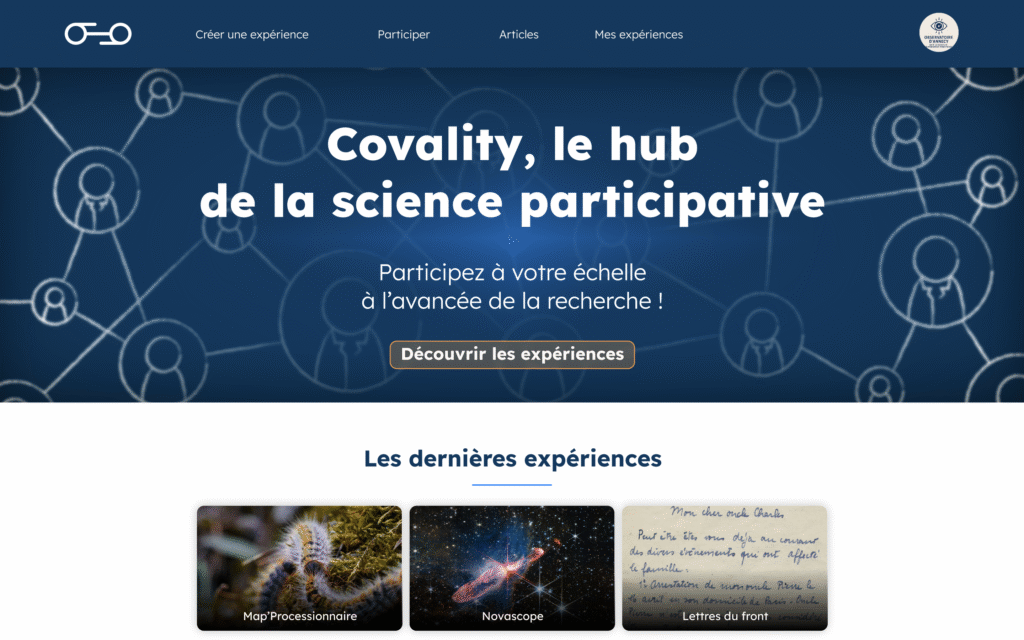 Covality est mon projet de mémoire de mastère, sur le thème de la science participative : il s’agit d’un mode de recherche où des chercheurs font appels à des volontaires non scientifiques pour les aider dans leurs travaux.