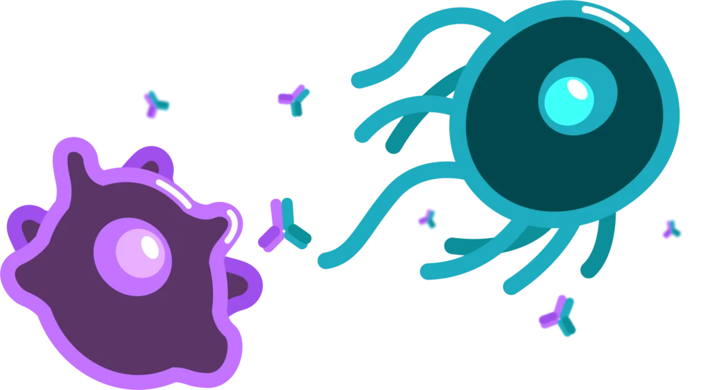 On peut voir ici une cellule cancéreuse (en violet) se faire reconnaitre par une cellule immunitaire (lymphocyte T, en cyan), par le biais d’anticorps.